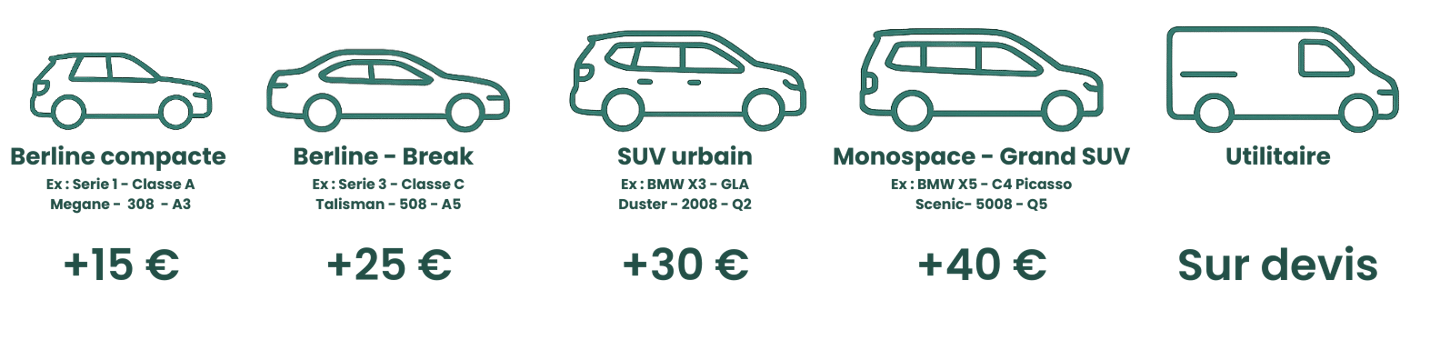 Ces services peuvent inclure une taxe supplémentaire selon la taille ou le degré de saleté du véhicule (multiples tâches, poils, vomis, etc.).